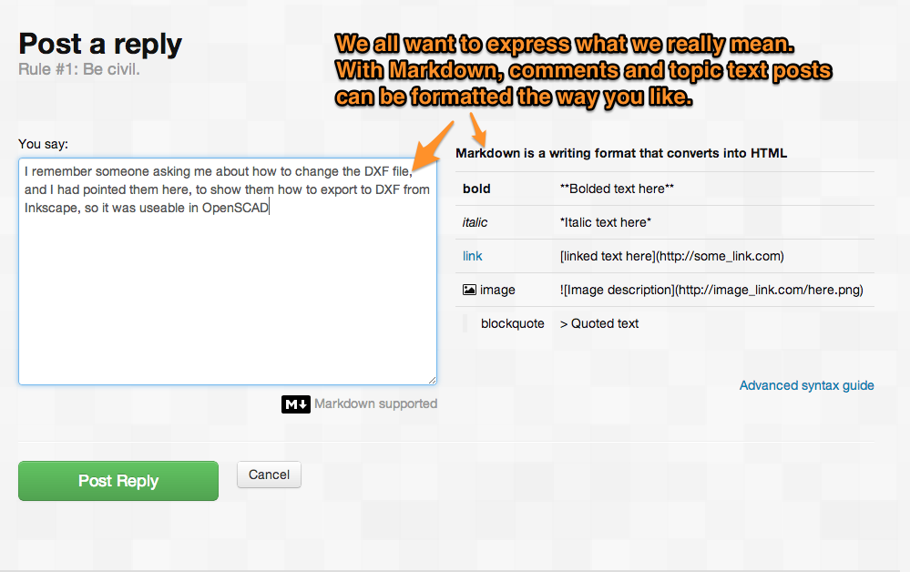 We all like to express ourselves in the way we really mean, so markdown has been enabled for comments, and in the text topics. If you want bold, you can have it–but not to the detriment of others! We don’t need another MySpace (the old version) on the internets.